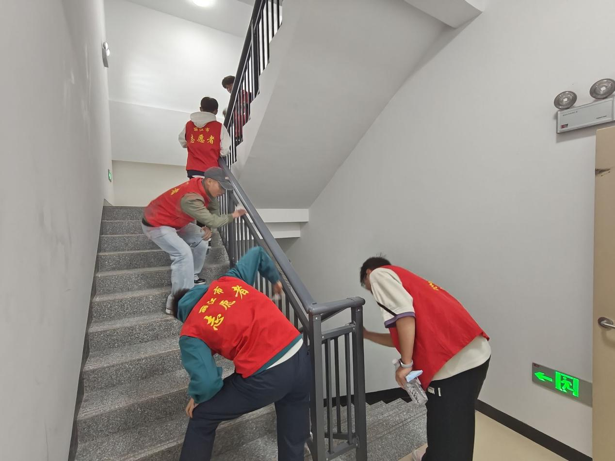 下午 14:00,220 名身着志愿者马褂的同学准时在田径场集结。活动以 “网格化分工、专业化清扫、团队化协作” 为原则,将参与者划分为 4 个大组、44 个专项小组,分别对接东苑 4 栋宿舍楼的 11 个楼层,实现公共区域清洁全覆盖。在各小组组长的统筹带领下,同学们迅速投入劳动实践:楼梯间里,大家逐阶擦拭扶手、清理墙面印迹与蛛网,对顽固污渍蹲地精细化清洁,让地面重拾洁净光泽;电梯轿厢内,志愿者们不仅擦拭壁面与按键面板,更细致清理门体缝隙积尘,兼顾 “面子” 与 “里子”;公共盥洗间与卫生间区域,同学们重点攻克洗漱台死角、洗衣机周边污垢,用双手消除卫生盲区,让社区环境焕然一新。